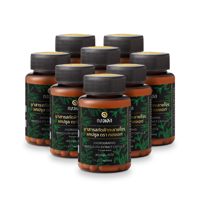 ยาสารสกัดฟ้าทะลายโจร แคปซูล ตราทองเอก ยาสามัญประจำบ้านแผนโบราณ 1 แคปซูล มีปริมาณสารสกัดฟ้าทะลายโจร 300 มิลลิกรัม เทียบเท่า ฟ้าทะลายโจร ชนิดบดผง 15,000 มิลลิกรัม (อัตราส่วน 1 ต่อ 50 เท่า) มีปริมาณ Andrographolide 20 มก. ต่อแคปซูล เปลือกแคปซูลผลิตจากพืช ผลิตจากโรงงานที่ได้ มาตรฐานการผลิต PIC/S GMP